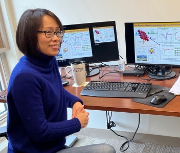 Another colleague who is excited to work side-by-side with Huang is her fellow new arrival, Ming, who is jointly appointed in the Department of Earth and Environmental Sciences. “Jier has a long list of accomplishments at the frontier of material science and renewable energy,” says Ming. “Her expertise will be central to forging interdisciplinary collaborations.” He foresees himself working with her in a number of ways. Her technical capabilities will help him study the optical properties of aerosol particles, especially those composed of organic compounds, and to research new materials for solar panels. But she will also help him consider the climate implications of novel renewable energy technologies. Beyond that, on a personal level, Ming is glad to welcome Huang. “It is always fun to talk to Jier, whether it is about the latest laser technology or the local real estate market (we are both house-hunting),” he writes. “She is humble, caring and generous. I am so grateful for having her as a colleague.”