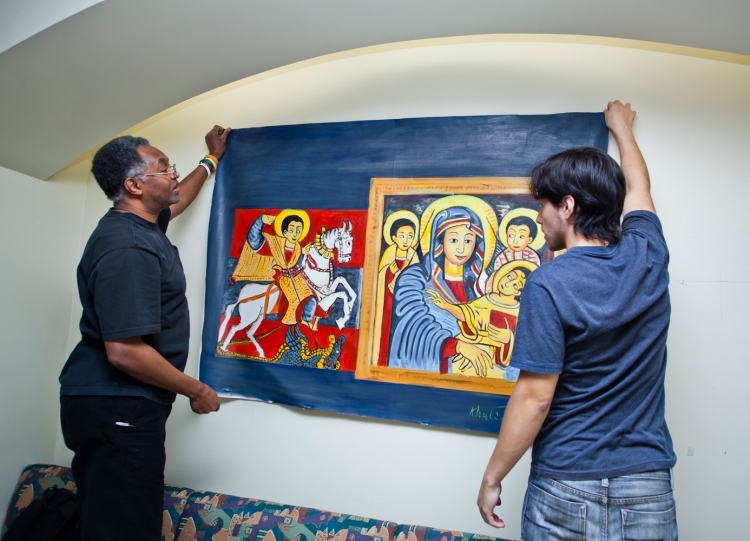 A trove of more than a dozen paintings en route to a Sudanese church undergoing restoration after being destroyed by arson comprise a current Bapst Library exhibition advocating universal acceptance and harmony.