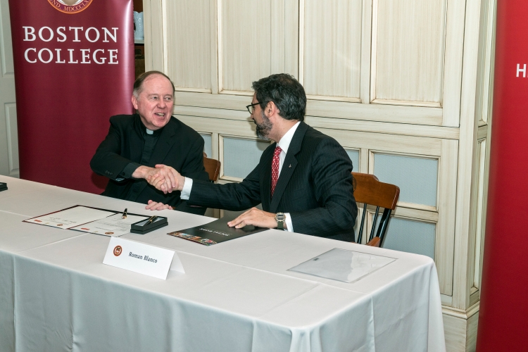 University President William P. Leahy, SJ, and Roman Blanco, president and CEO of Santander Bank US, formally extended the BC-Santander agreement at a July 8 signing ceremony attended by BC and Santander representatives. Under the agreement, Santander will continue its support for the University’s international doctoral program in social welfare, headquartered in the Graduate School of Social Work.